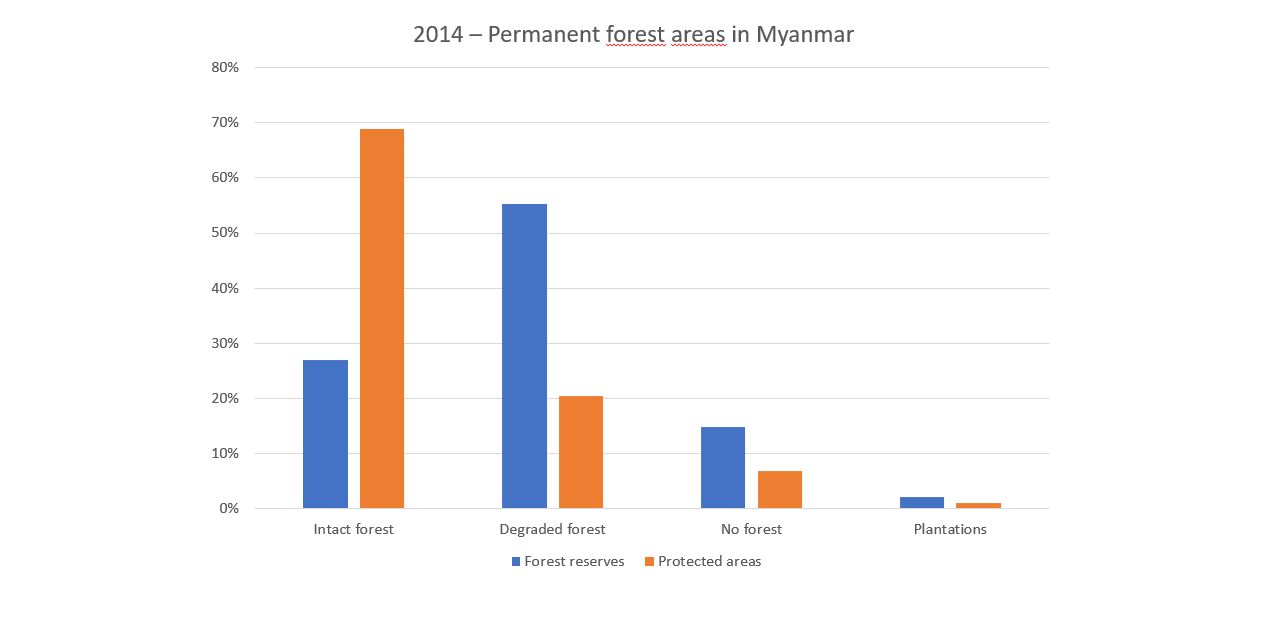 The Government is officially aiming at protecting and conserving forests on 40 per cent of Myanmar’s territory by 2030. However, the areas that so far have received an official status of protection are still experiencing a high rate of forest degradation. The recent publication Indigenous peoples, land rights and forest conservation in Myanmar found that in 2014, only 24 per cent of Myanmar’s forest was classified as permanent forest and that one-third of the 2.07 million ha of intact forests lost between 2002 and 2014, were inside these areas.