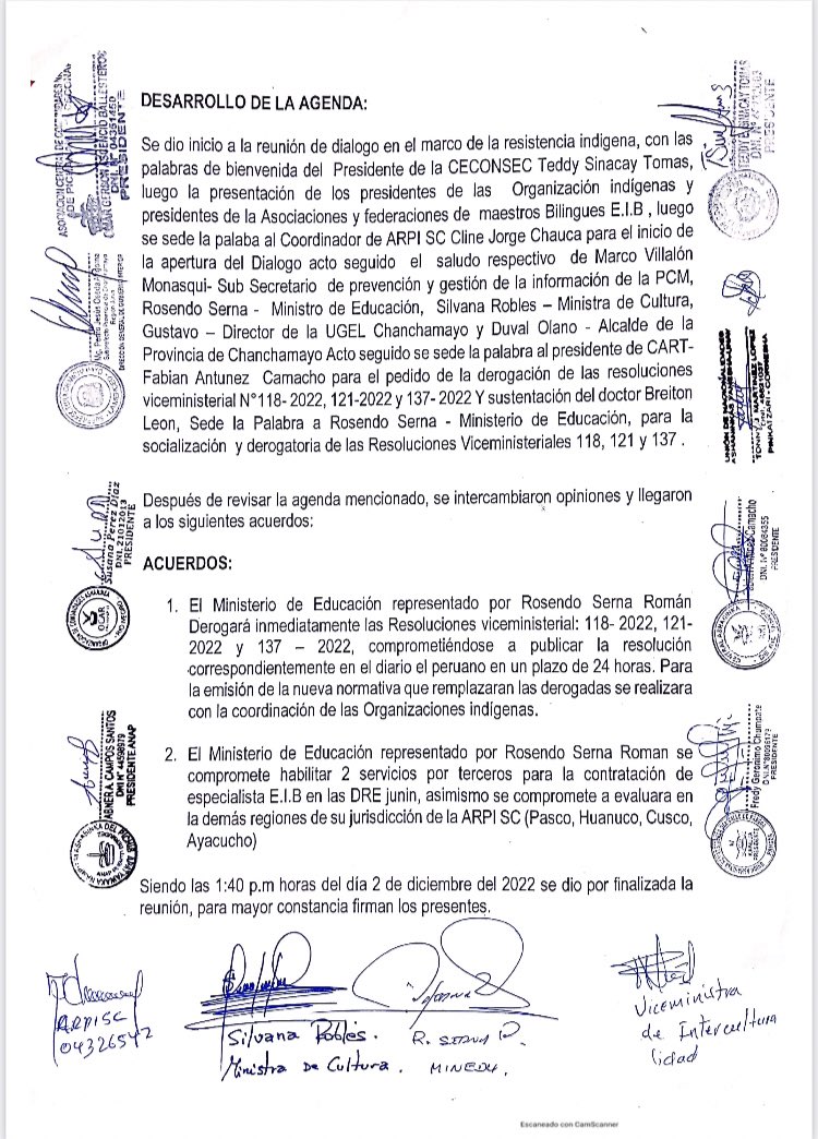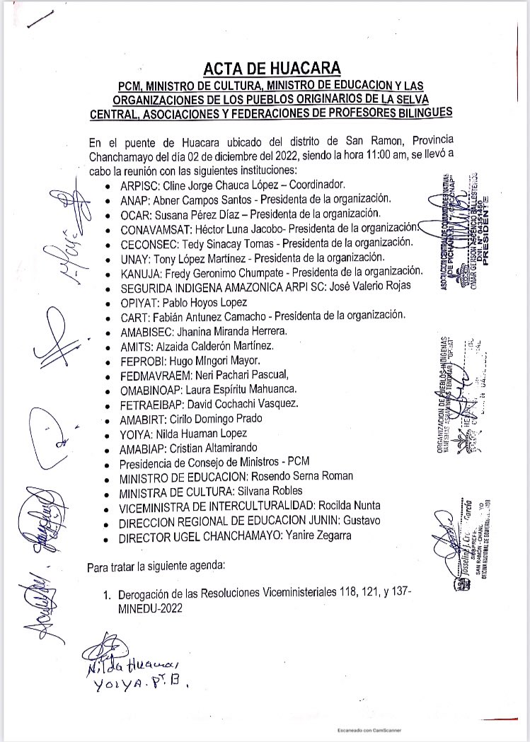 El documento también es firmado por la ministra de Cultura, Silvana Robles; la viceministra de Interculturalidad, Rocilda Nunta; entre otras autoridades representativas de los pueblos indígenas.