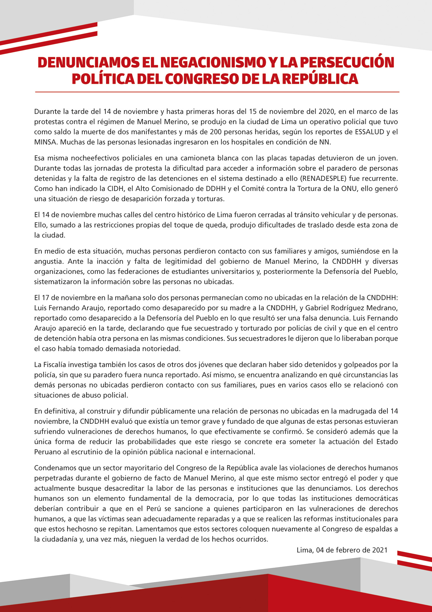 Comunicado sobre el #Negacionismo y la #PersecuciónPolítica de mayoría del @congresoperu hacia las personas e instituciones que denunciamos las graves violaciones de DDHH perpetradas durante el contexto de las protestas contra el Golpe de Estado.