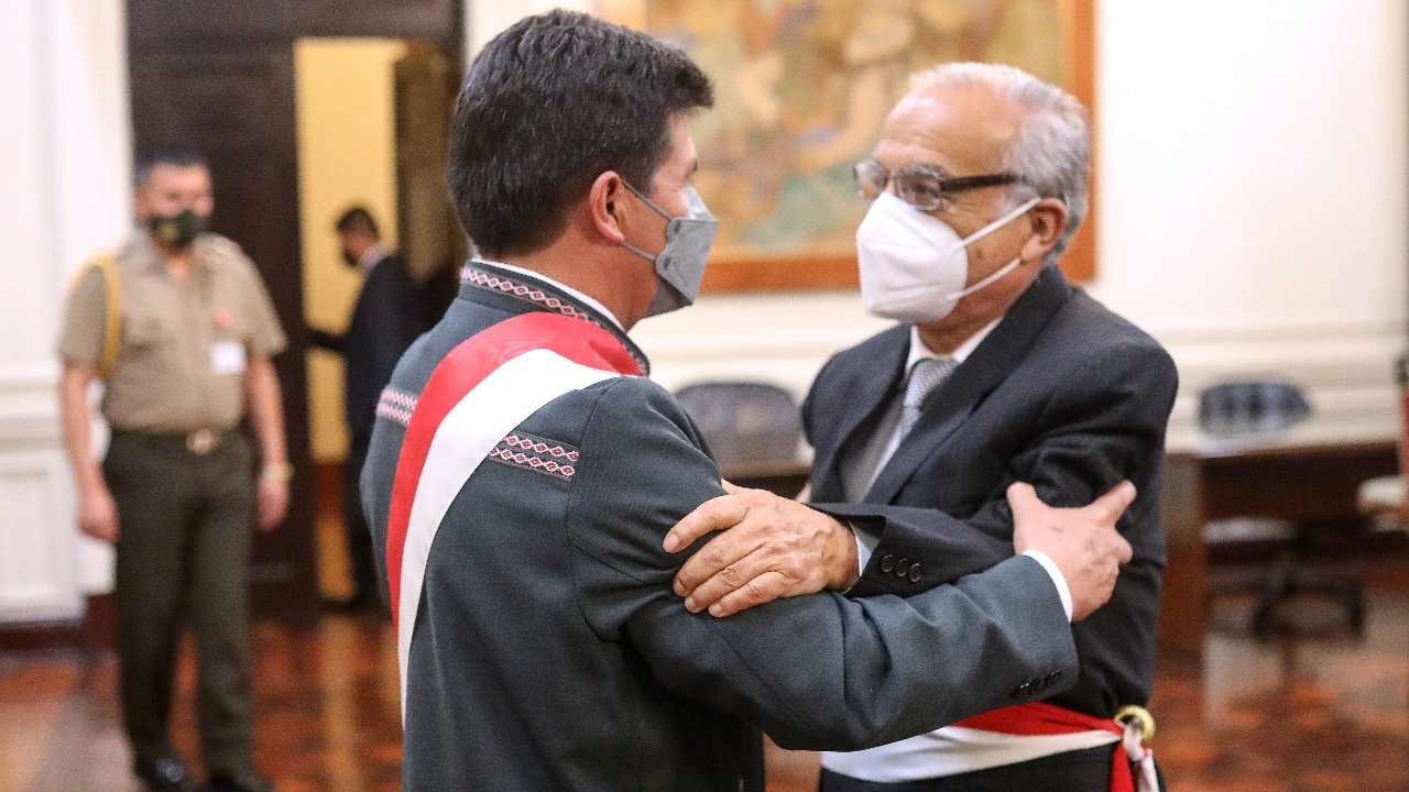 Pedro Castillo y Aníbal Torres saludándose luego de que este asumiera como primer ministro. Foto: Presidencia