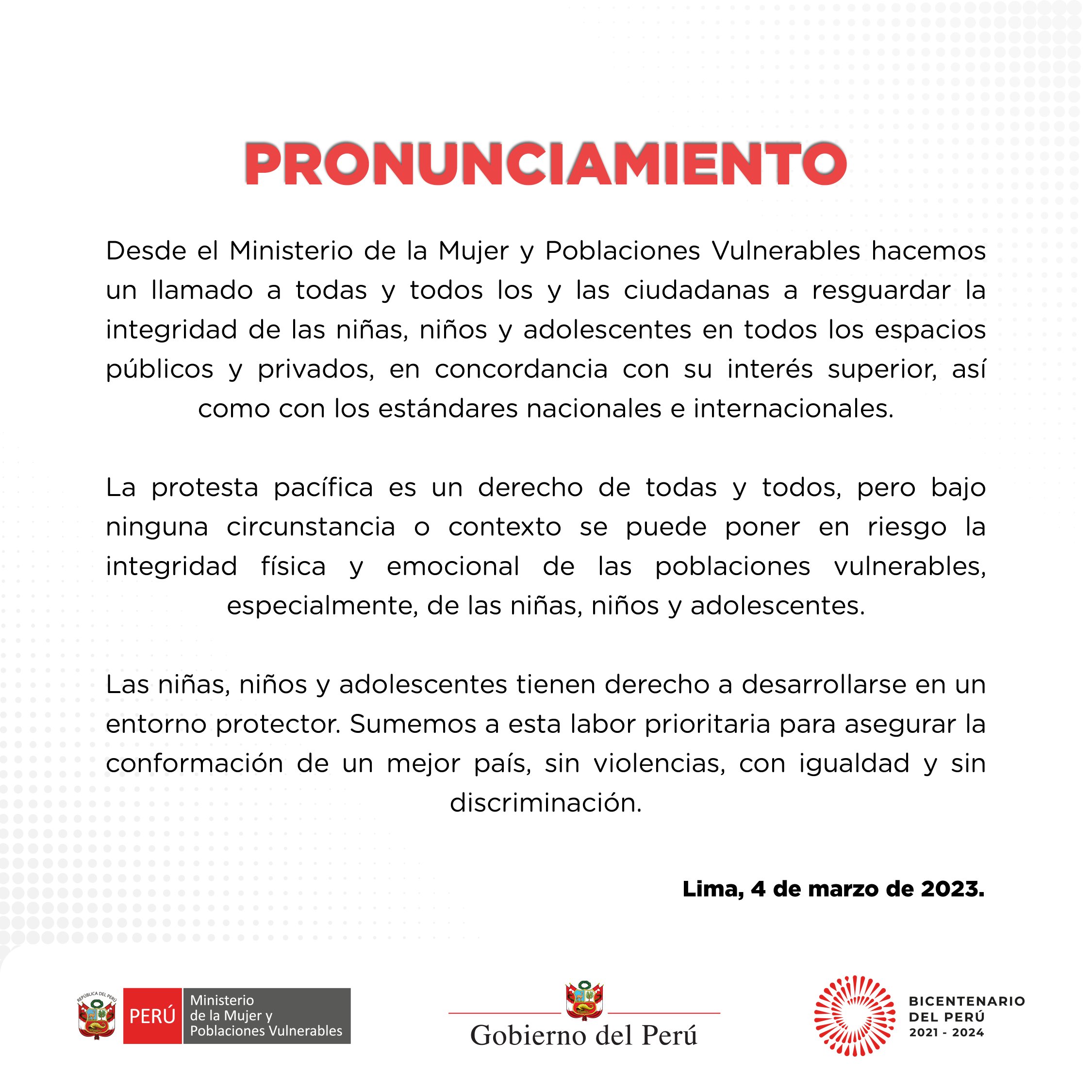Este escrito va en línea con lo señalado por el Ministerio de la Mujer días atrás, que lejos de rechazar la represión excesiva de la Policía contra las madres protestantes, cuestionó que llevaran a sus hijos.