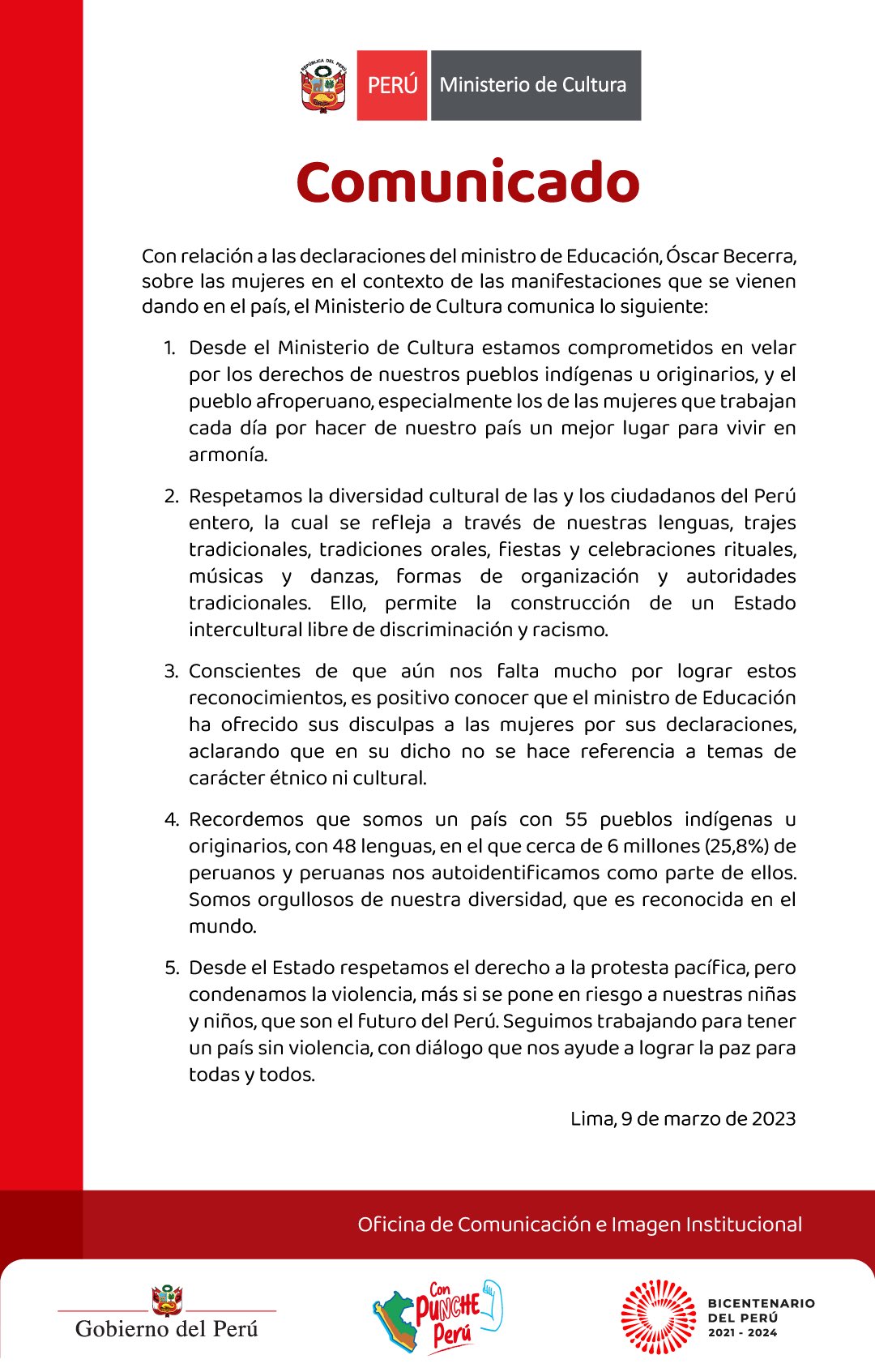 “Es positivo conocer que el ministro de Educación ha ofrecido sus disculpas a las mujeres por sus declaraciones, aclarando que en su dicho no se hace referencia a temas de carácter étnico ni cultural”, indica el Mincul.