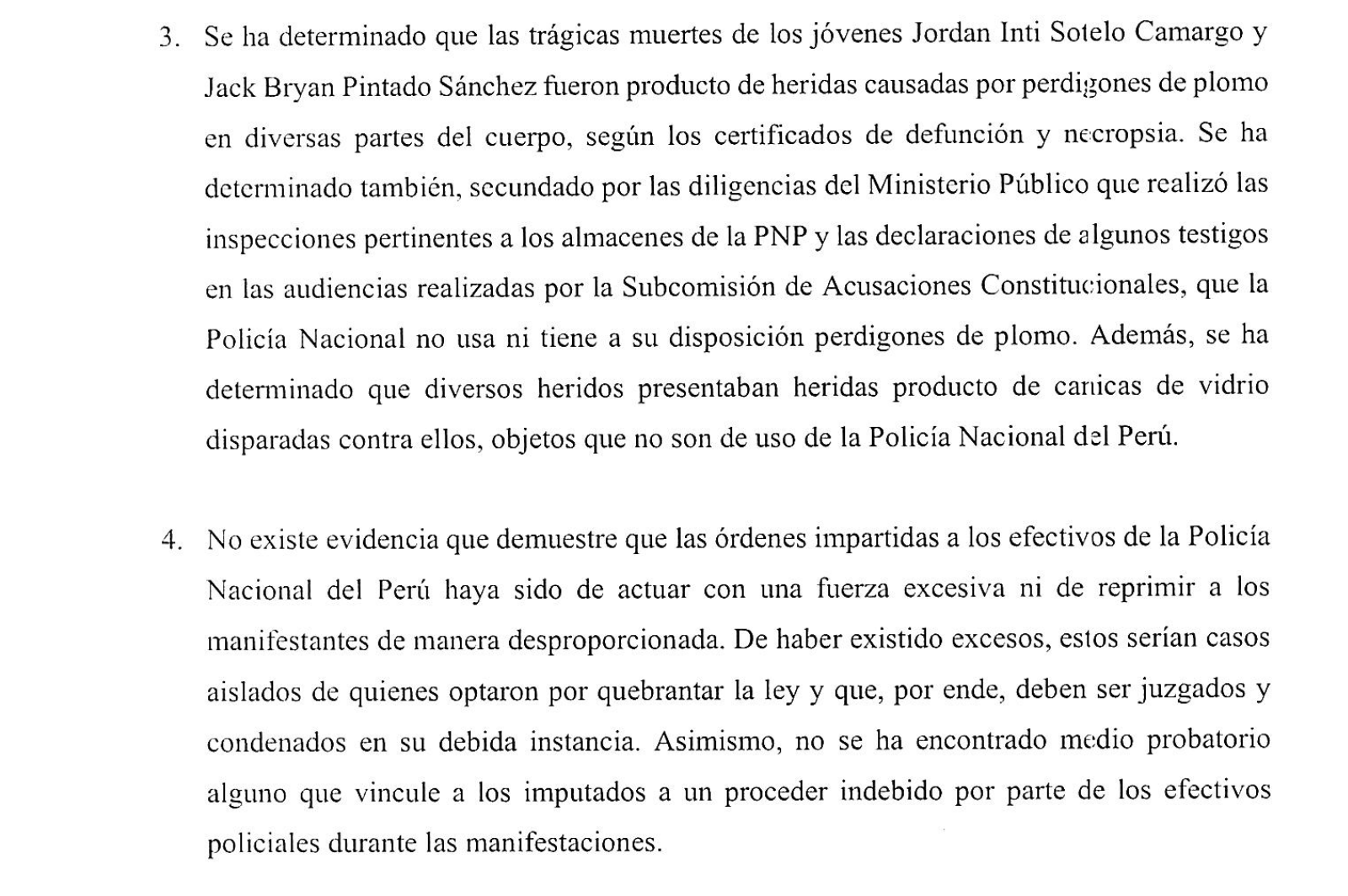 En consecuencia, al no existir evidencia que demuestre que las lesiones sufridas por manifestantes, incluida la muerte de dos jóvenes, fueron producidas por la policía, el informe limpia de toda responsabilidad a Merino y compañía.