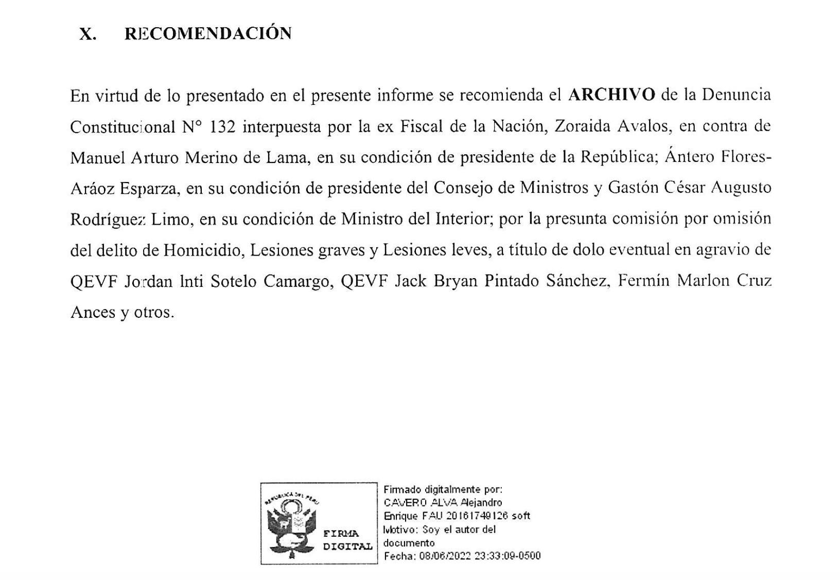 Lo hace al recomendar que se mande al archivo la denuncia constitucional que interpuso la exfiscal de la Nación, Zoraida Avalos, contra Merino, Flores Araoz y Rodríguez por estos hechos.