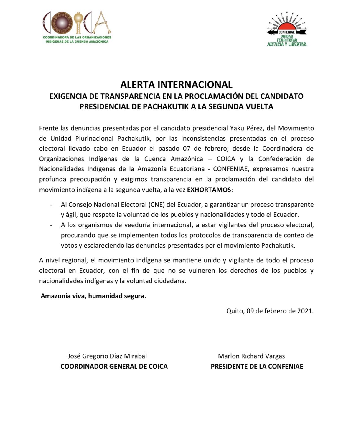 Horas más tarde se pronunció la Coordinadora de las Organizaciones Indígenas de la Cuenca Amazónica (COICA) junto a la Confederación de Nacionalidades Indígenas de la Amazonía Ecuatoriana (CONFENIAE).