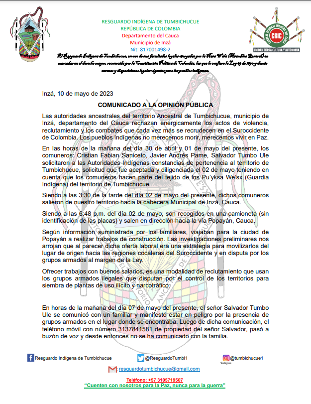 Servindi, 11 de mayo, 2023.- Autoridades del territorio ancestral de Tumbichucue, municipio de Inzá, departamento del Cauca, pidieron investigar con urgencia la situación de tres de sus comuneros desaparecidos desde el 2 de mayo, en Colombia.