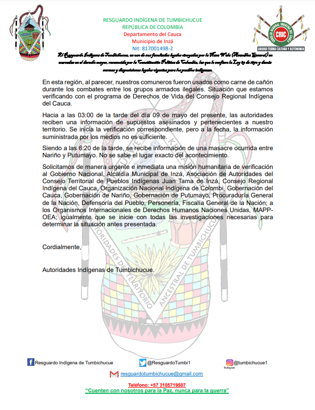 Se sabe que los tres comuneros salieron del territorio de Tumbichucue la tarde del 2 de mayo hacia la cabecera Municipal de Inzá, en Cauca, donde fueron recogidos por una camioneta sin placas.