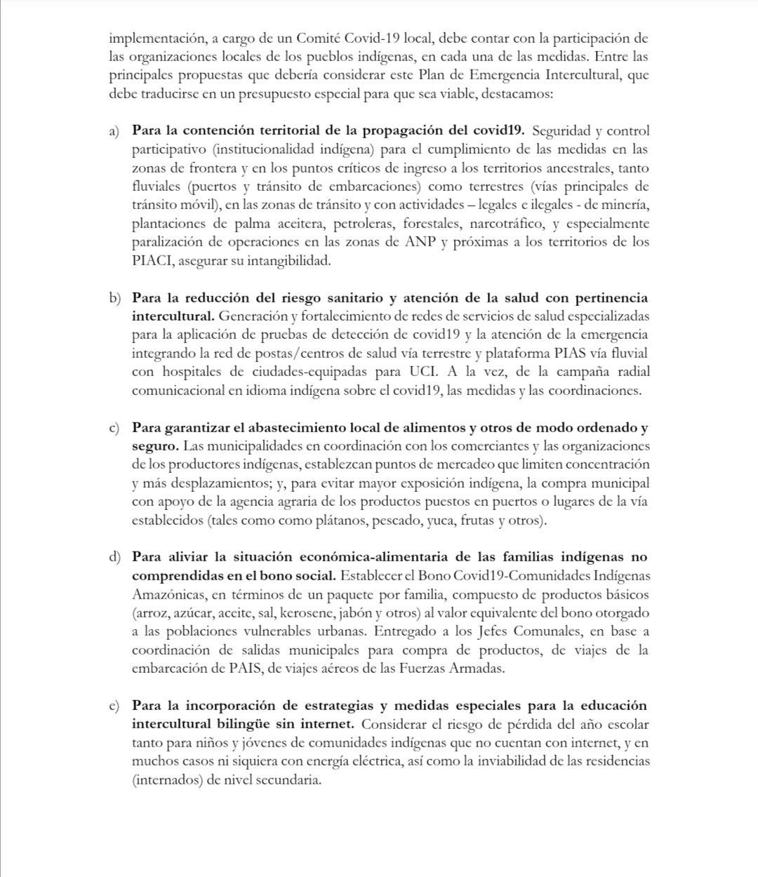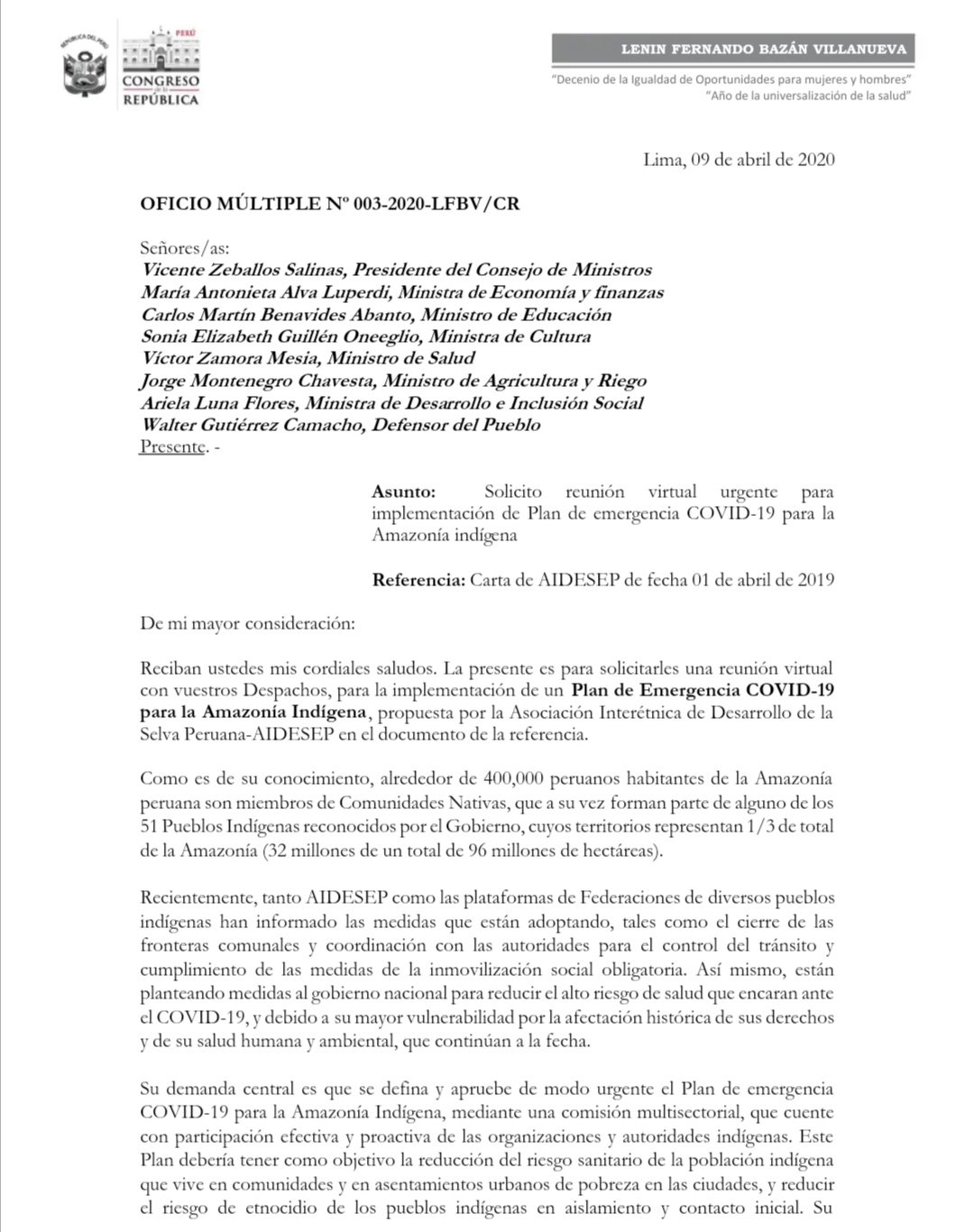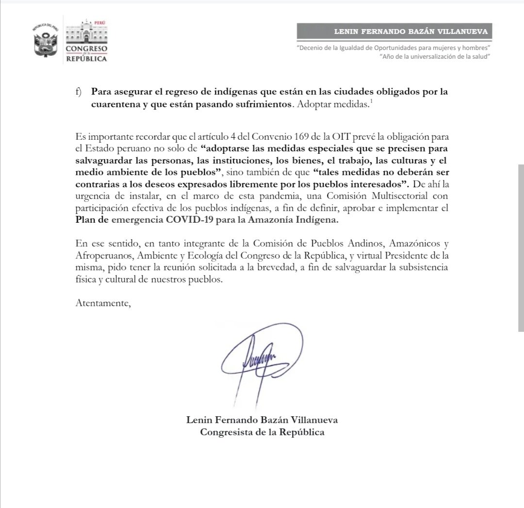 A través del oficio múltiple N° 003-2020-LFBV/CV, el congresista Lenin Fernando Bazán Villanueva del Frente Amplio, agrupación política que preside la CPAAAAE, explica que el plan debe tener como objetivo reducir el riesgo sanitario de la población indígena, tanto de las comunidades y aquellas en zonas urbanas