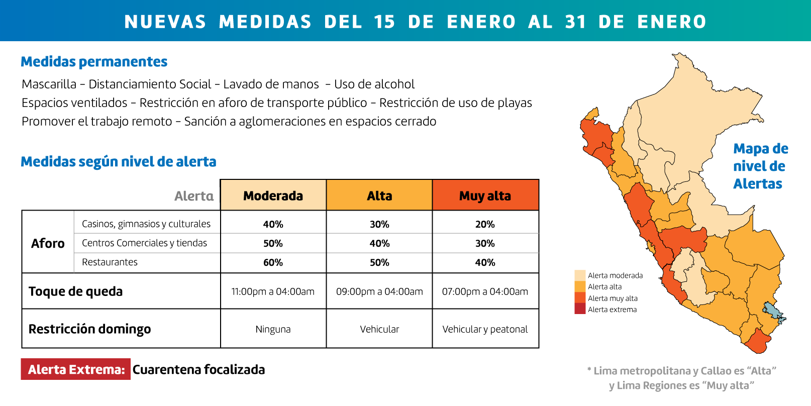 Las medidas estarán vigentes del 15 al 30 de enero y varían de acuerdo al nivel de alerta (moderada, alta y muy alta) en la que se encuentra cada departamento, indicaron.