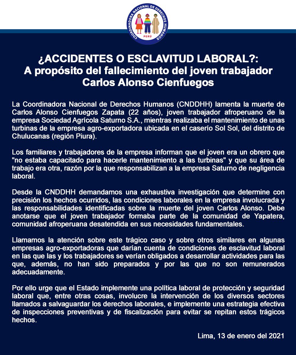 Demandamos una investigación exhaustiva que esclarezca los hechos e identifique responsabilidades en la muerte del trabajador Carlos Alonso Cienfuegos (22), quien habría sido obligado a realizar labores de riesgo para las que no estaba capacitado en una empresa agrícola de Piura. pic.twitter.com/BOHtxV3cGZ