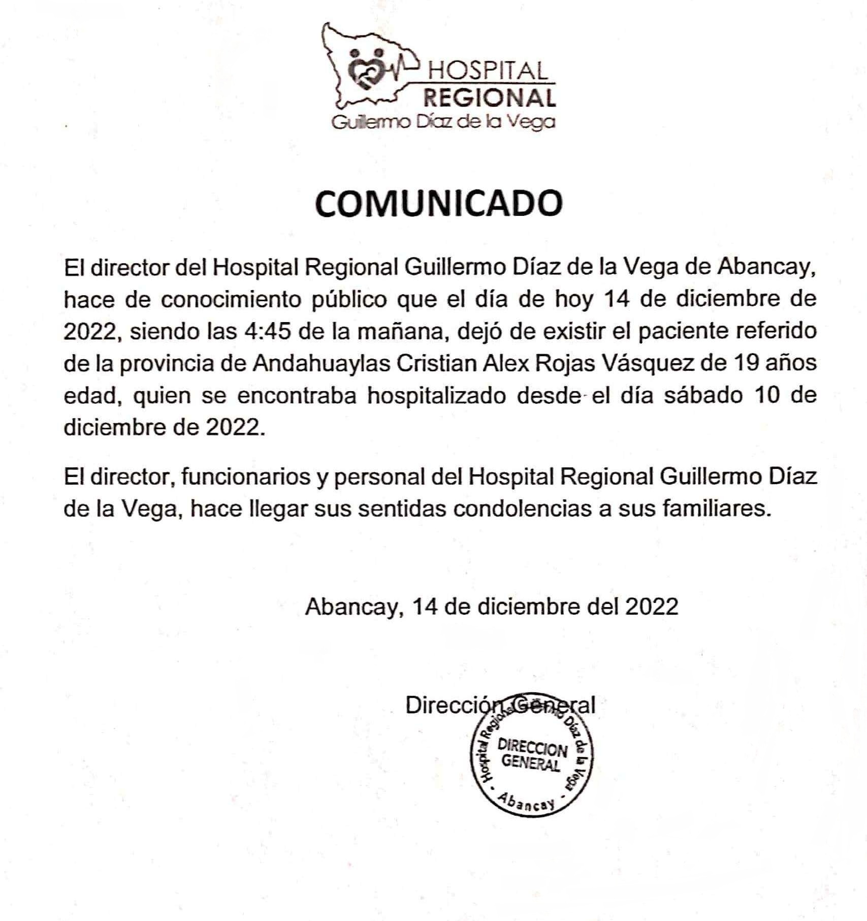 Comunicado del Hospital Guillermo Díaz de la Vega confirmado otro fallecido este 14 de diciembre. Foto: difusión
