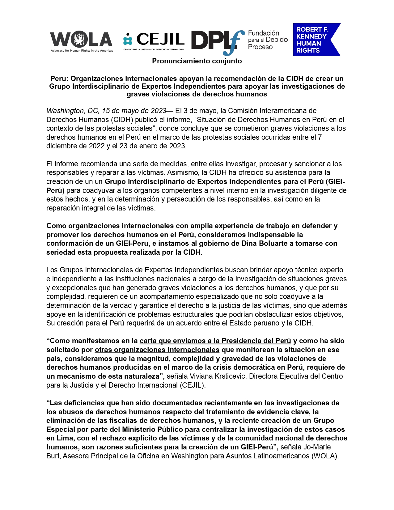 Servindi, 15 de mayo, 2023.- Organizaciones internacionales expresaron su apoyo a la recomendación de la CIDH al Estado peruano de crear un Grupo Interdisciplinario de Expertos Independientes (GIEI) para apoyar las investigaciones de graves violaciones de derechos humanos.