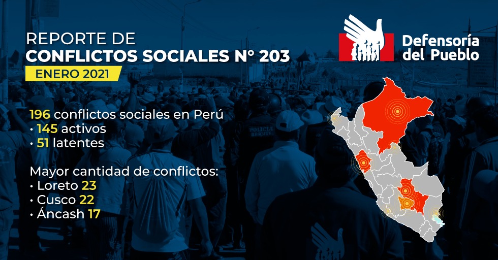 De los 196 conflictos sociales registrados en enero de 2021, 23 se registraron en Loreto, 22 en el Cusco y 17 en Áncash.