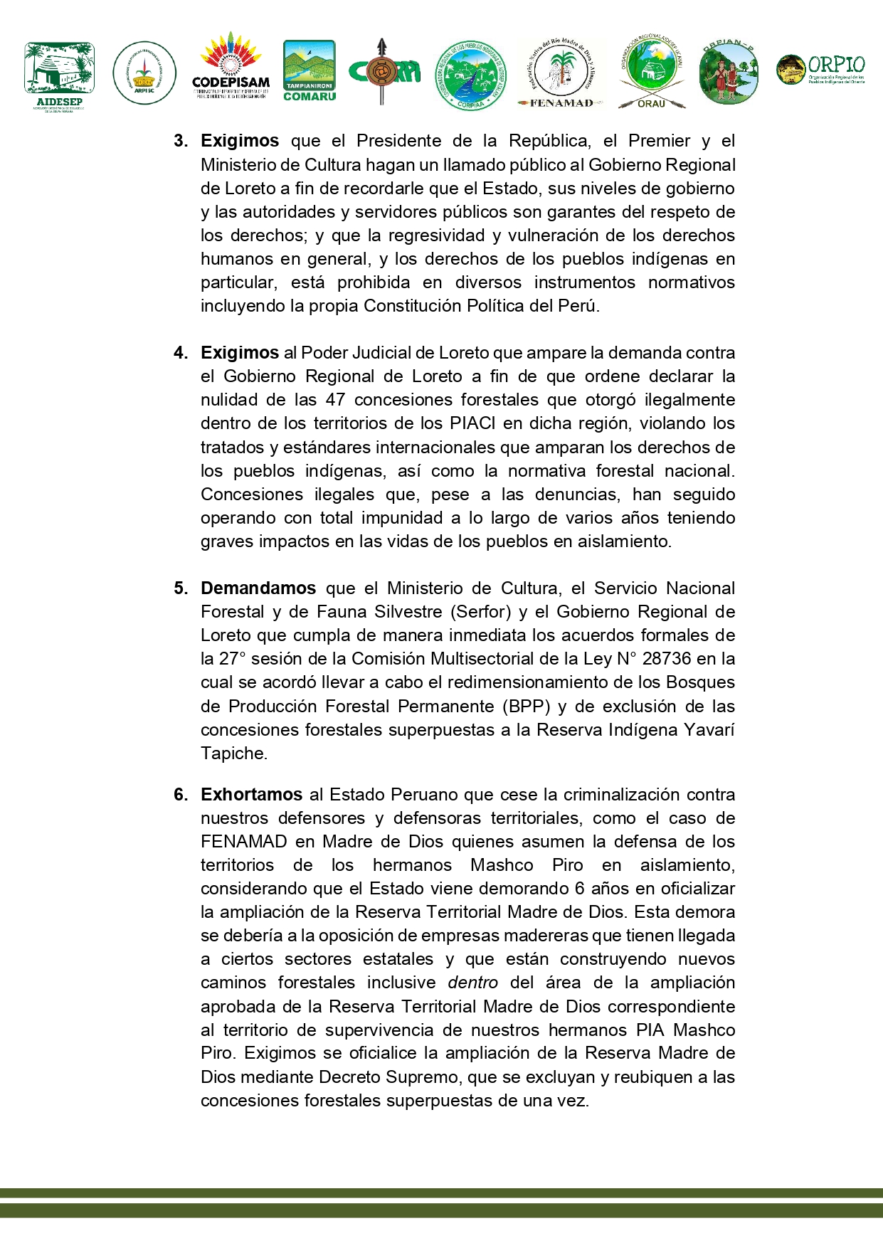 Asimismo, exigen al Mincul, el GORE Loreto y el Servicio Nacional Forestal y de Fauna Silvestre (Serfor) cumplir con los acuerdos formales de la 27° sesión de la Comisión Multisectorial de la Ley N° 28736.