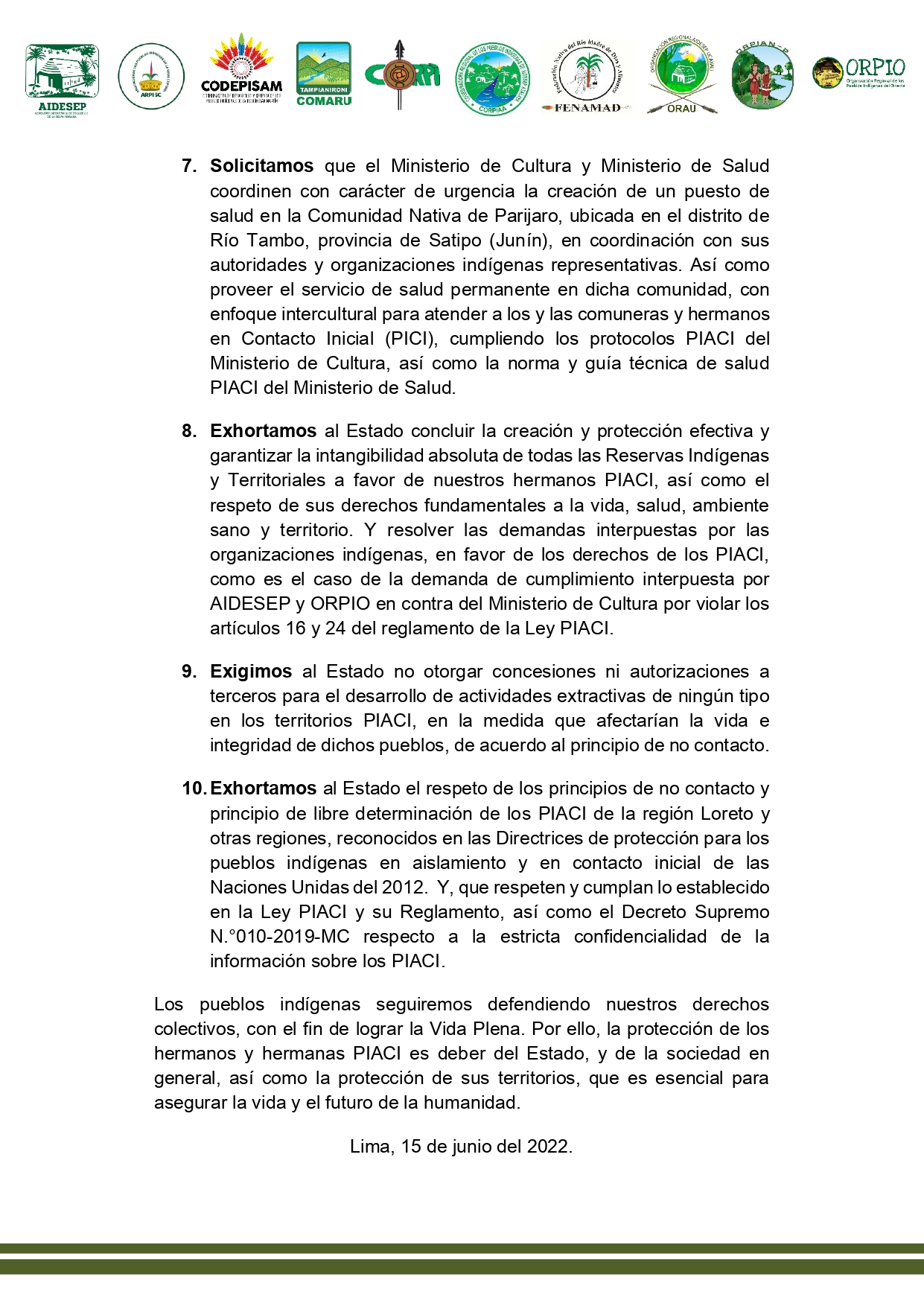 “Los pueblos indígenas seguiremos defendiendo nuestros derechos colectivos, con el fin de lograr la Vida Plena. Por ello, la protección de los hermanos y hermanas PIACI es deber del Estado, y de la sociedad en general”, indicaron.