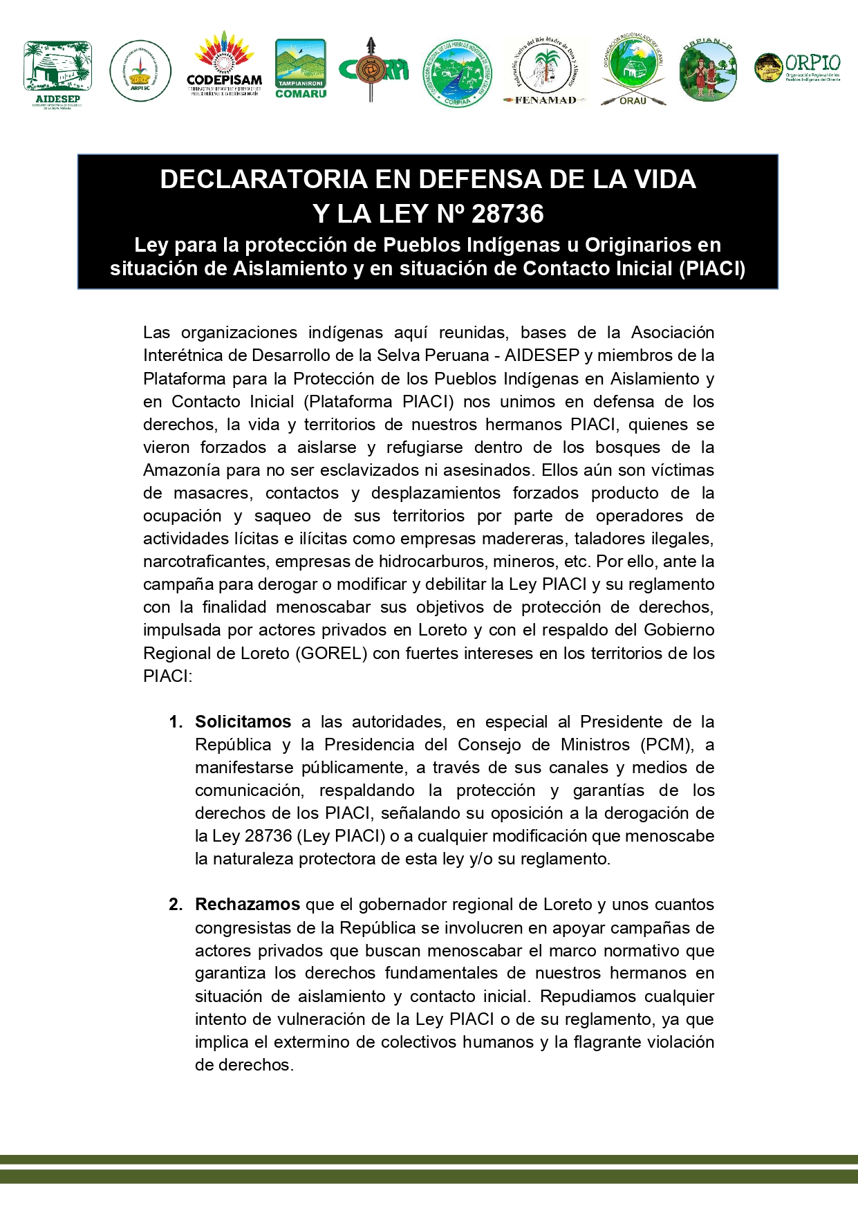 La declaratoria es firmada por las nueve regionales de la Asociación Interétnica de Desarrollo de la Selva Peruana (Aidesep) y miembros de la Plataforma para la Protección de los Pueblos Indígenas en Aislamiento y en Contacto Inicial (Plataforma PIACI).