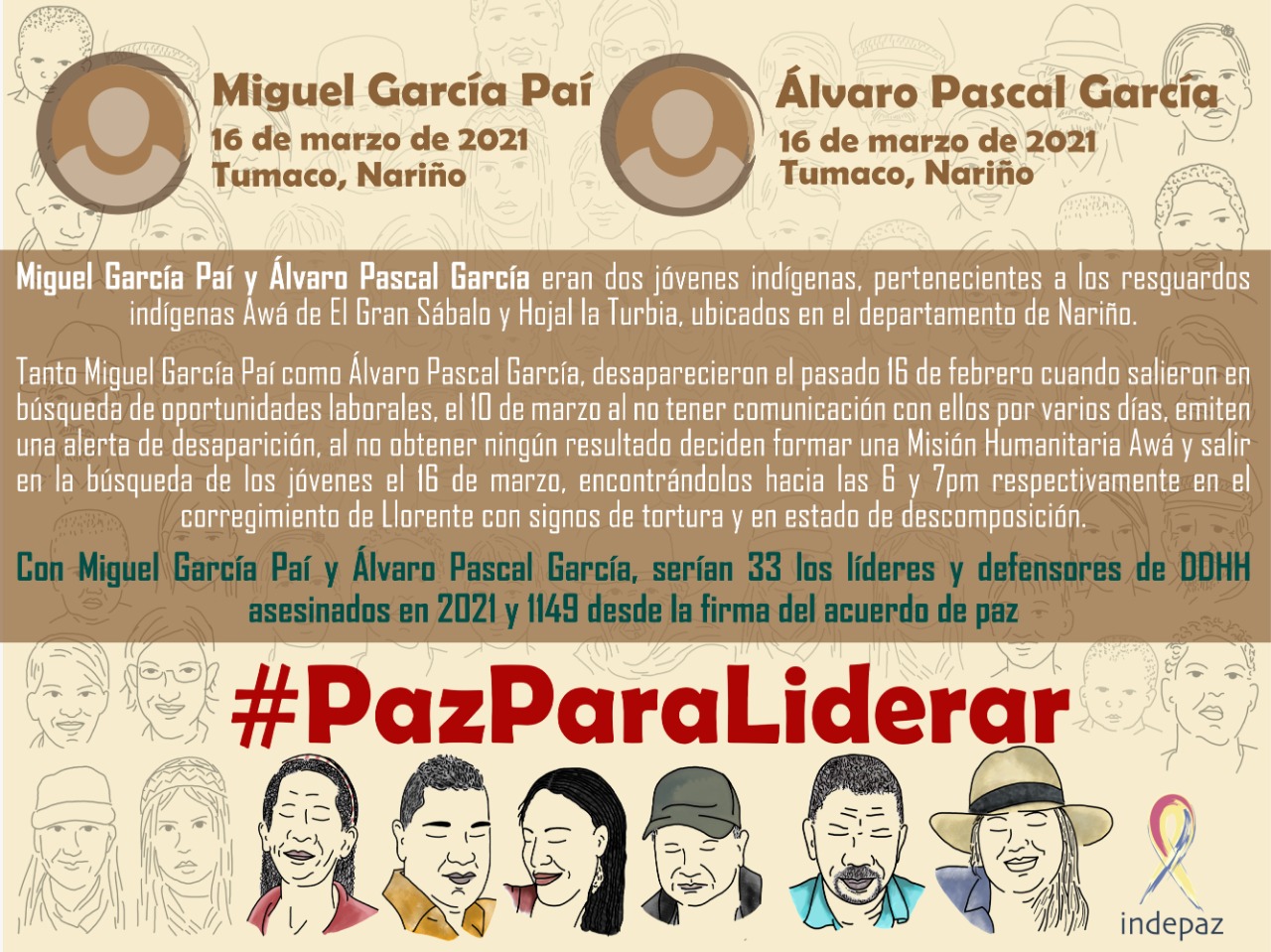 Indepaz registró el primer doble crimen el 16 de marzo. Ese día fueron encontrados los cuerpos sin vida de Miguel García Paí y Álvaro Pascal García.