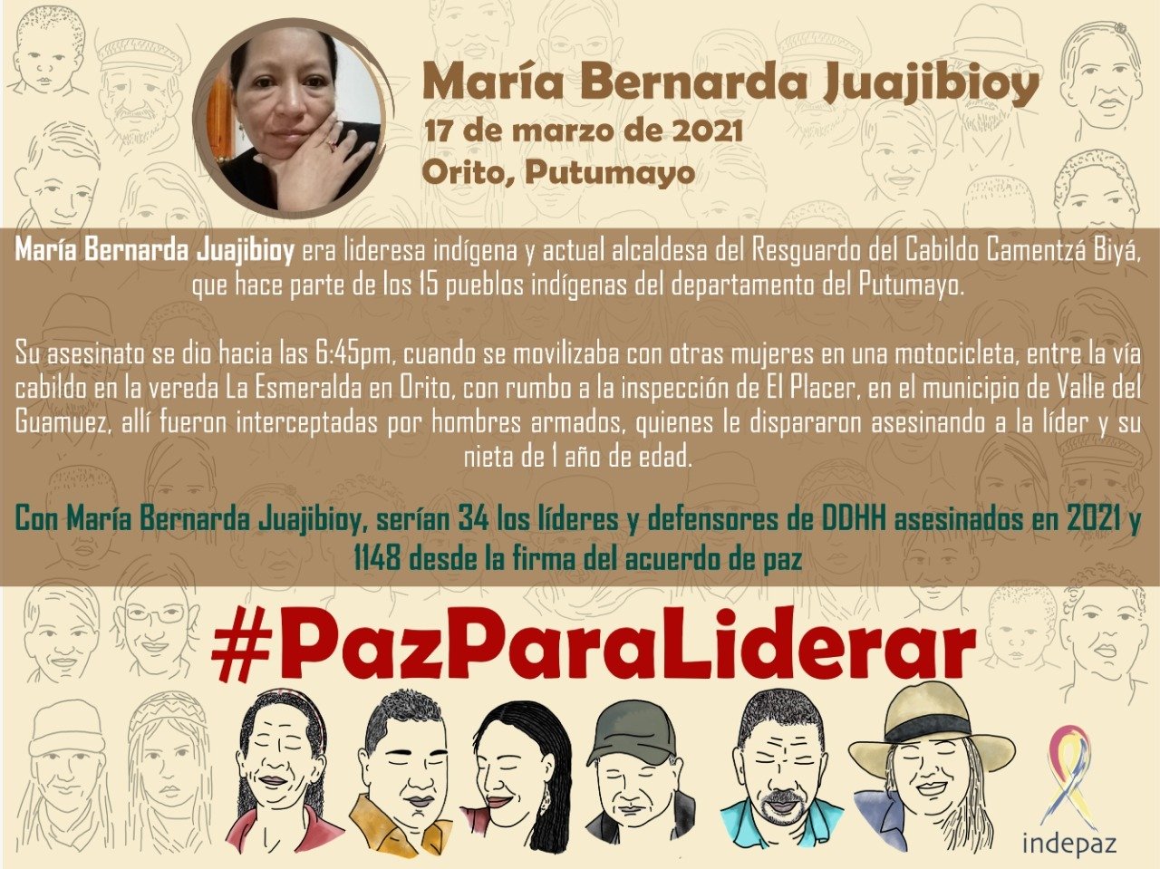 Dos días después de este hallazgo, el 18 de marzo, la lideresa indígena María Bernarda Juajibioy fue asesinada en la vereda La Esmeralda, en Orito, departamento de Putumayo.