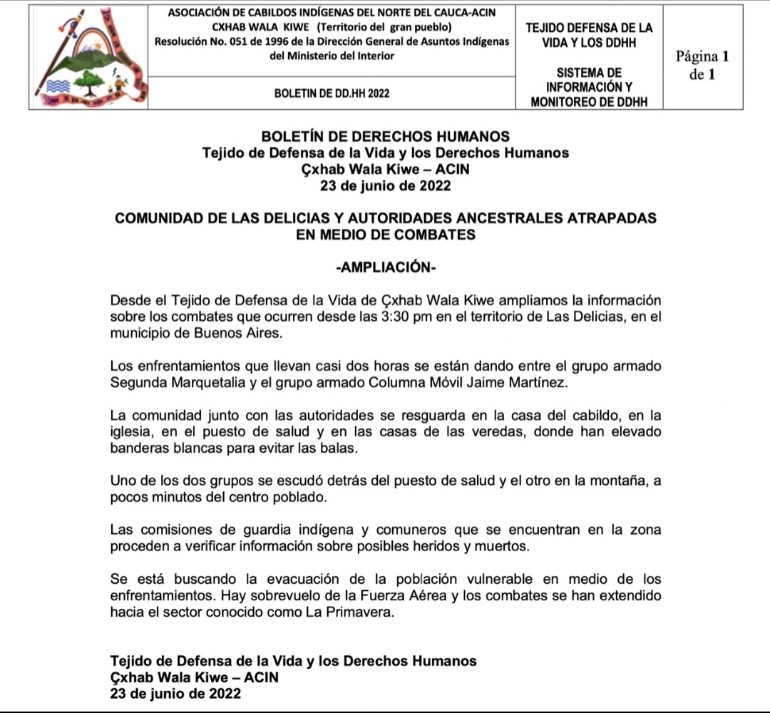 Nota de prensa que da cuenta del último episodio de fuego cruzado registrado en el centro poblado Las Delicias, el 23 de junio. Foto: CRIC