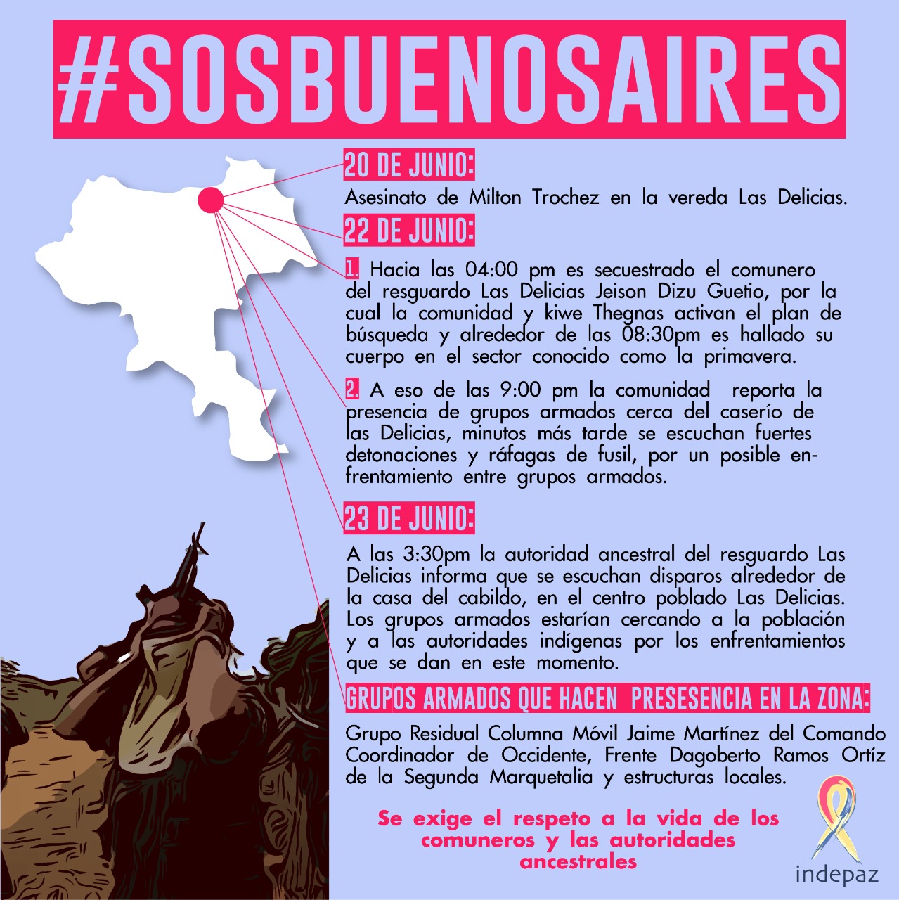 Servindi, 24 de junio, 2022.- Un cruce de fuego entre grupos armados ilegales registrado la tarde del 23 de junio puso en peligro a indígenas del centro poblado Las Delicias, municipio de Buenos Aires, en el norte del Cauca (Colombia).