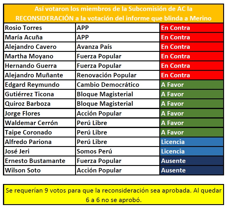 Por su parte, Waldemar Cerrón y Elizabeth Taipe de Perú Libre, Paul Gutiérrez y Segundo Quiroz del Bloque Magisterial, Jorge Flores de Acción Popular y Edgar Reymundo de Cambio Democrático votaron a favor de la reconsideración, pero fue insuficiente.