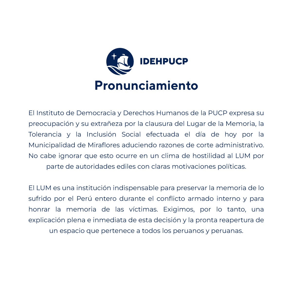 Solicitamos a @MuniMiraflores un informe detallado de las razones que han motivado el cierre del @LUMoficial. Esta decisión resulta grave pues se trata de un espacio de conmemoración, reflexión, encuentro y diálogo en torno a temas de #DerechosHumanos. (1/2) pic.twitter.com/Tg8ElECU01
