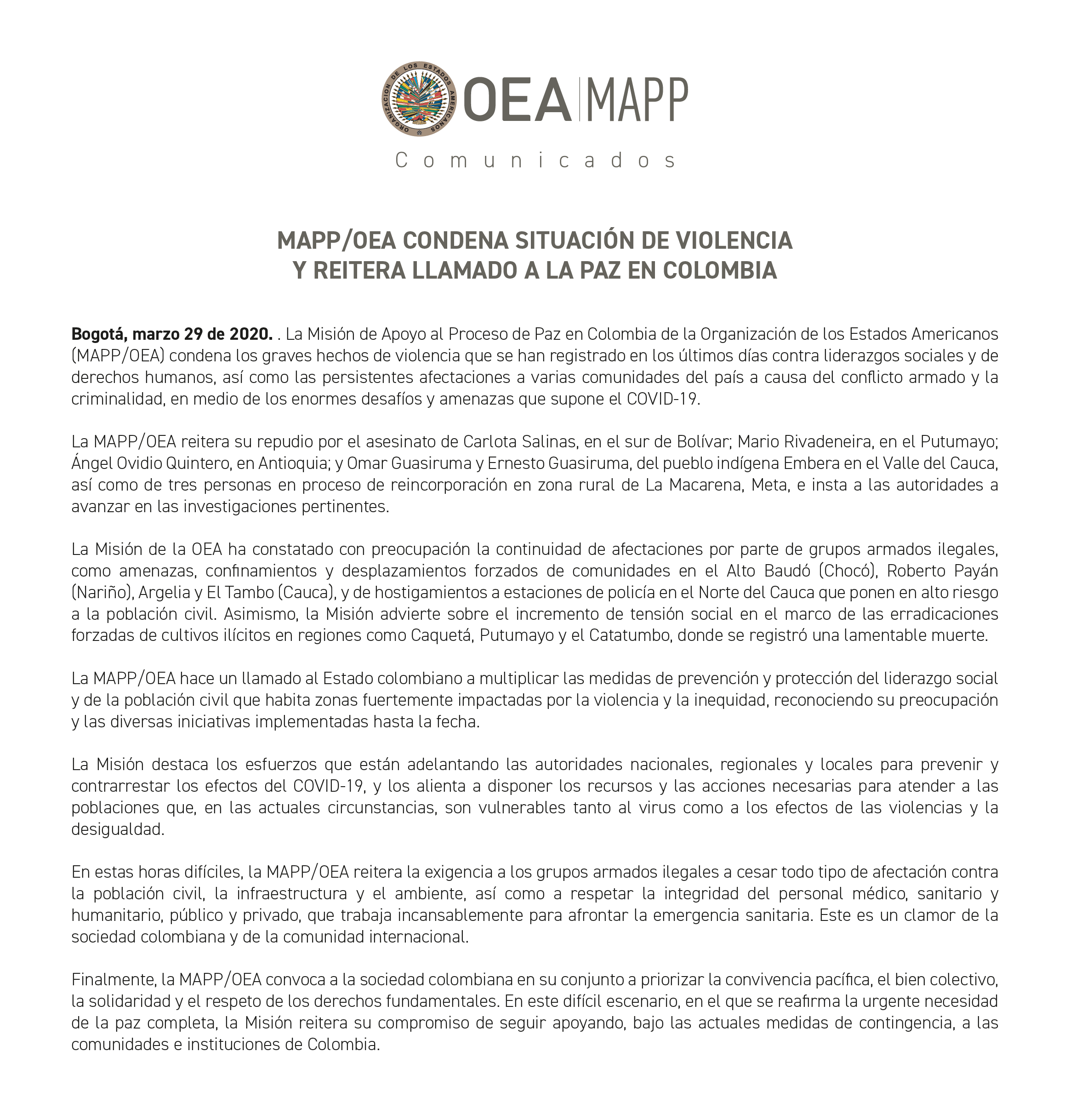 A través de un comunicado, la OEA reiteró su repudio contra el asesinato de Carlota Salinas, en el sur de Bolívar; Marco Rivadeneira, en el Putumayo; Ángel Ovidio Quintero, en Antioquia; y Omar Guasiruma y Ernesto Guasiruma, del pueblo indígena Embera en el Valle del Cauca.
