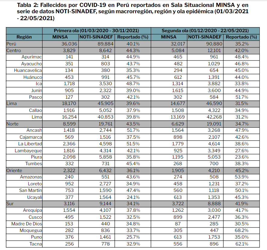 Dicho grupo estableció que, durante la primera ola, de marzo a noviembre de 2020, hubo 89.884 decesos; y en la segunda ola, de diciembre a mayo de 2021, 90.880 fallecidos.