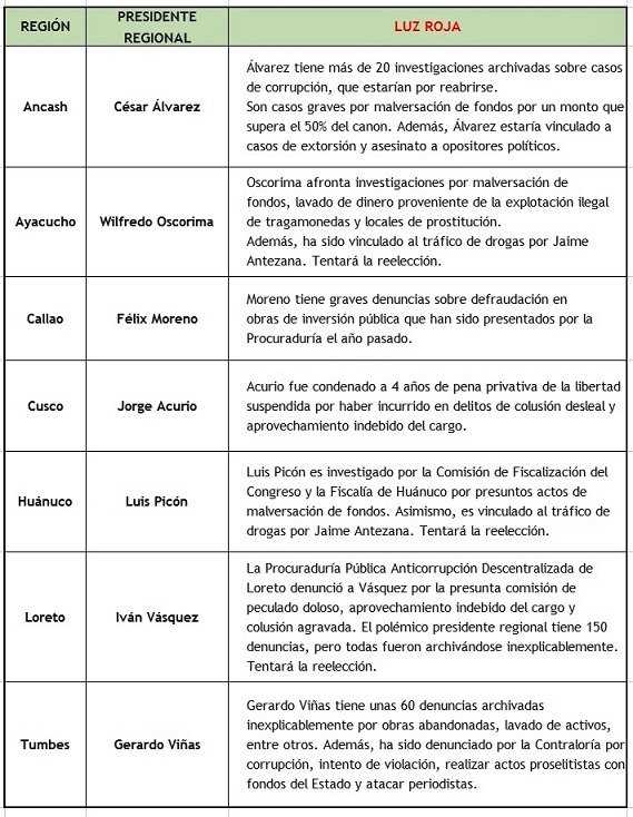 Otra Mirada, 2 de mayo, 2014.- A propósito de las elecciones regionales y municipales de octubre próximo, la situación de ingobernabilidad en varias regiones del país se torna preocupante por las graves acusaciones en los que se ven envueltos los Presidentes Regionales.