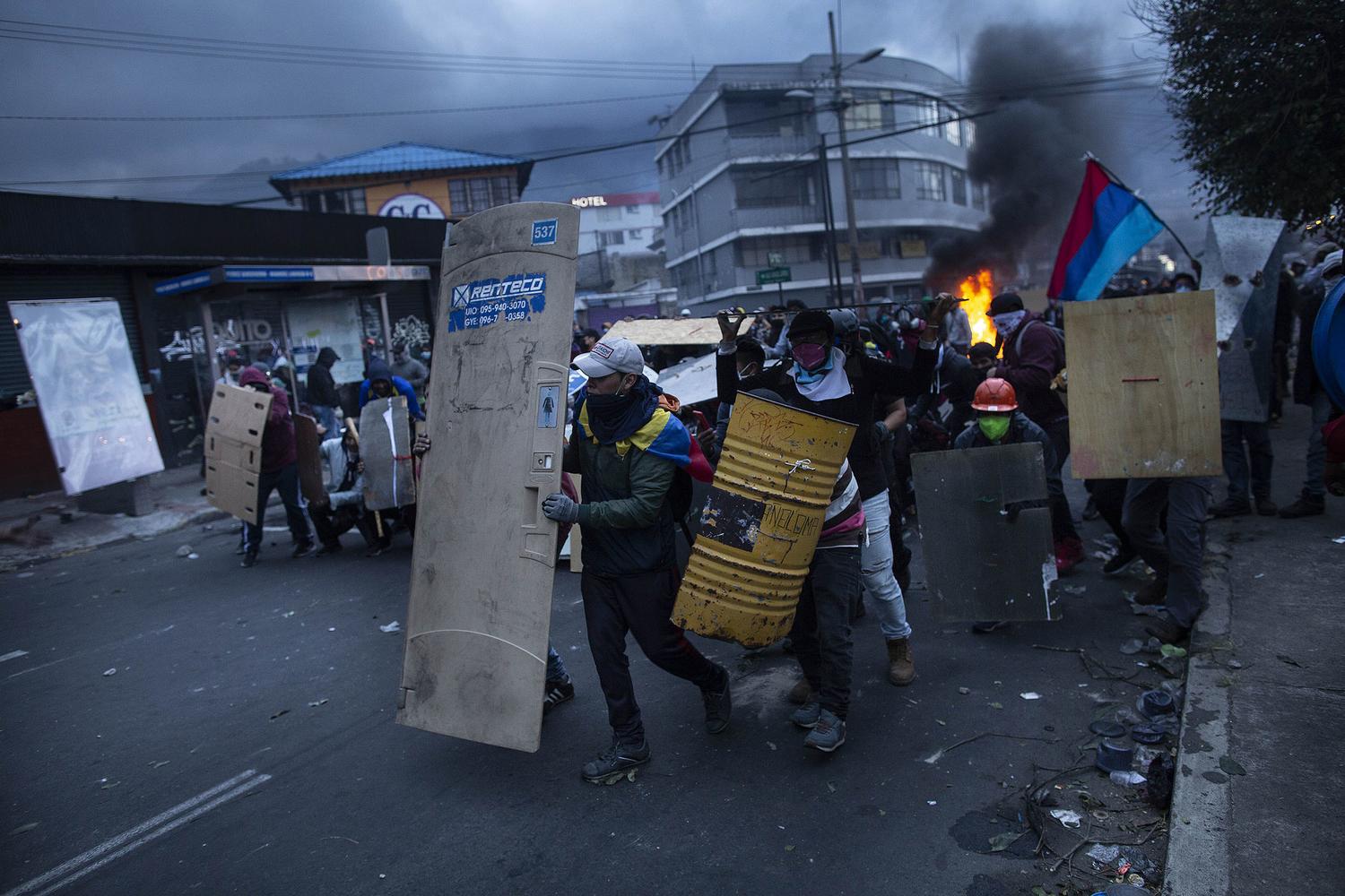 Manifestantes se protegen de bombas lacrimógenas lanzadas por policías en paro nacional de Ecuador. Foto: El Salto/Edu León
