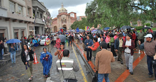 Ecuachaski, 13 de marzo, 2012.- Con consignas, gritos, canciones, alegría, humor, valor, sabiduría entraron al gran Guapondélig Cuenca los caminantes y marchantes que salieron el día 8 de marzo de El Pangui- Zamora Chinchipe.