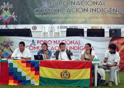 Fue muy estimulante ver reunidos para hablar del derecho a la comunicación a indígenas de los pueblos nasa, awa, inga, wayuu, uwa, pastos, embera, arhwaco, kokonuko, sikuani, misak, kamkuamo, kamentsa, koya, yanakona, muisca, katio, zenu, bora, pijao y otras comunidades colombianas, así como de Bolivia, Perú y Ecuador, pertenecientes a más de 30 organizaciones. La delegación oficial de Bolivia contó con la participación de Wilma Aliaga de la Coordinadora Audiovisual Indígena Originaria de Bolivia (CAIB) y Humberto Claros del Sistema Plurinacional de Comunicación Originaria Indígena.